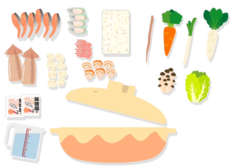| 内容量 | 秋鮭切身:40g×6切 ボイル甘えび:12尾 ボイル帆立:6個 えびつみれ:3個 かにつみれ:3個 とりごぼうつみれ:3個 パーナ片貝:4枚 するめいか:200g うどん:250g みそだれ:50g×2袋 |